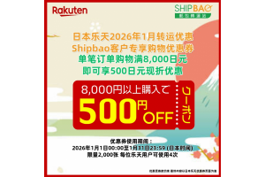 Shipbao转运客户单笔订单满8,000円 即可享500円购物优惠 优惠券使用期间 :   2026年1月1日00:00-1月31日23:59(日本时间) 领券连结(限量2,000张, 每位乐天用户可使用4次) :  https://b.link/SBRTCoupon202601 详情请浏览【乐天优惠活动】  https://www.shipbao.cn/information/rakuten