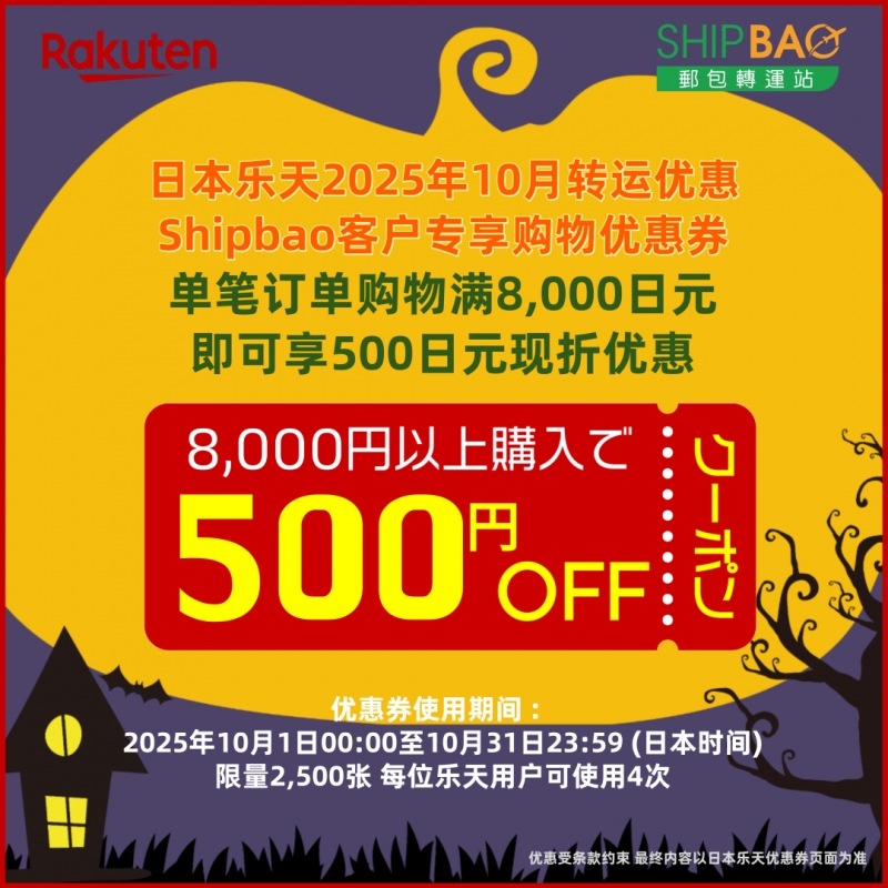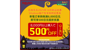 Shipbao转运客户单笔订单满8,000円 即可享500円购物优惠 优惠券使用期间 : 2025年10月1日00:00-10月31日23:59(日本时间) 领券连结(限量2,500张, 每位乐天用户可使用4次) : https://b.link/SBRTCoupon202510 详情请浏览【乐天优惠活动】 https://www.shipbao.cn/information/rakuten