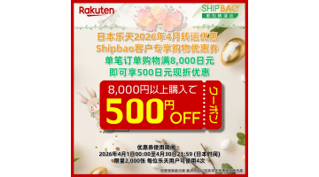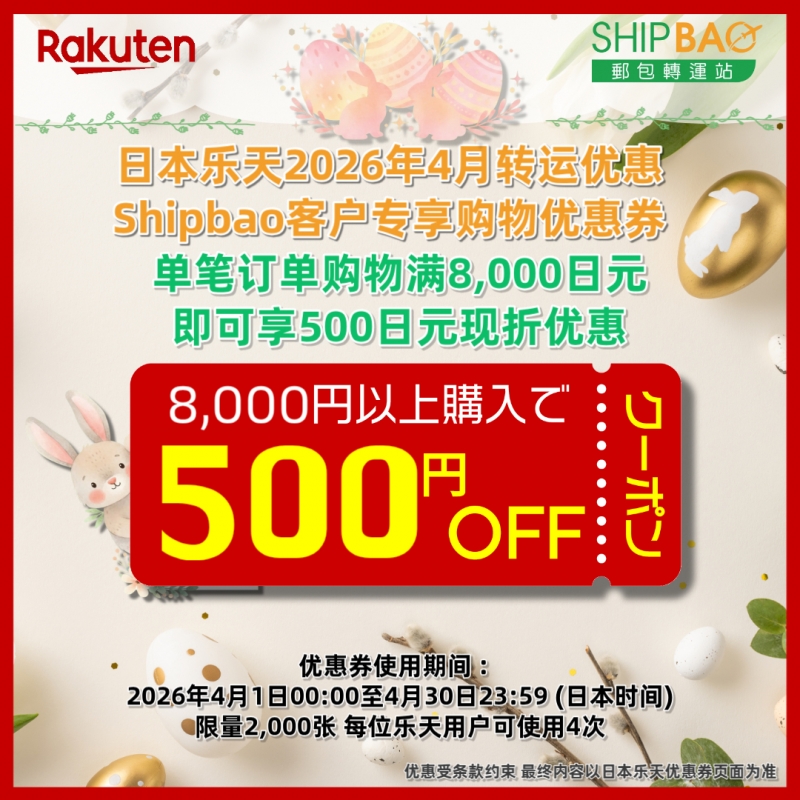 Shipbao转运客户单笔订单满8,000円 即可享500円购物优惠 优惠券使用期间 : 2026年4月1日00:00-4月30日23:59(日本时间) 领券连结(限量2,000张, 每位乐天用户可使用4次) : https://b.link/SBRTCoupon202604 详情请浏览【乐天优惠活动】 https://www.shipbao.cn/information/rakuten